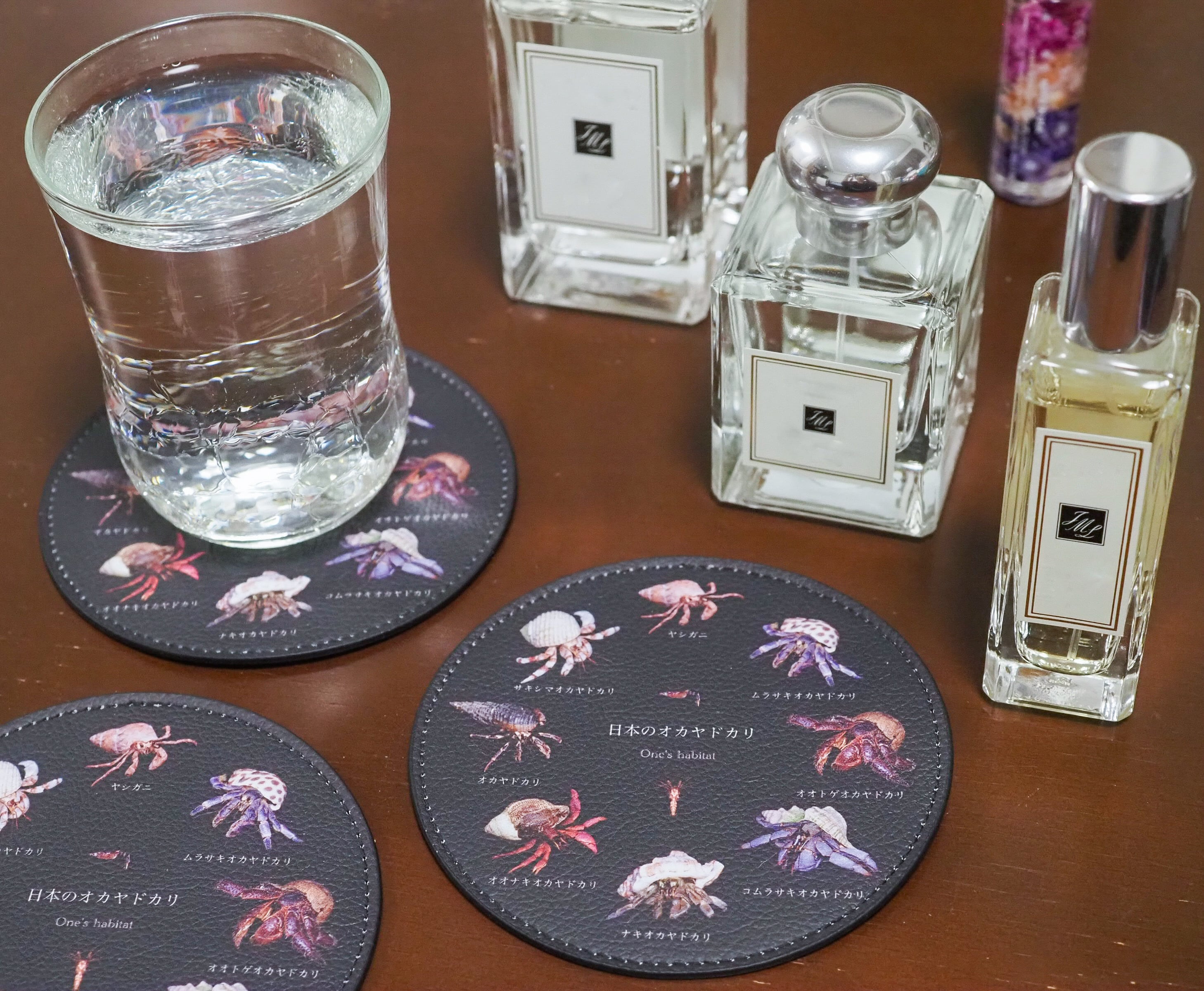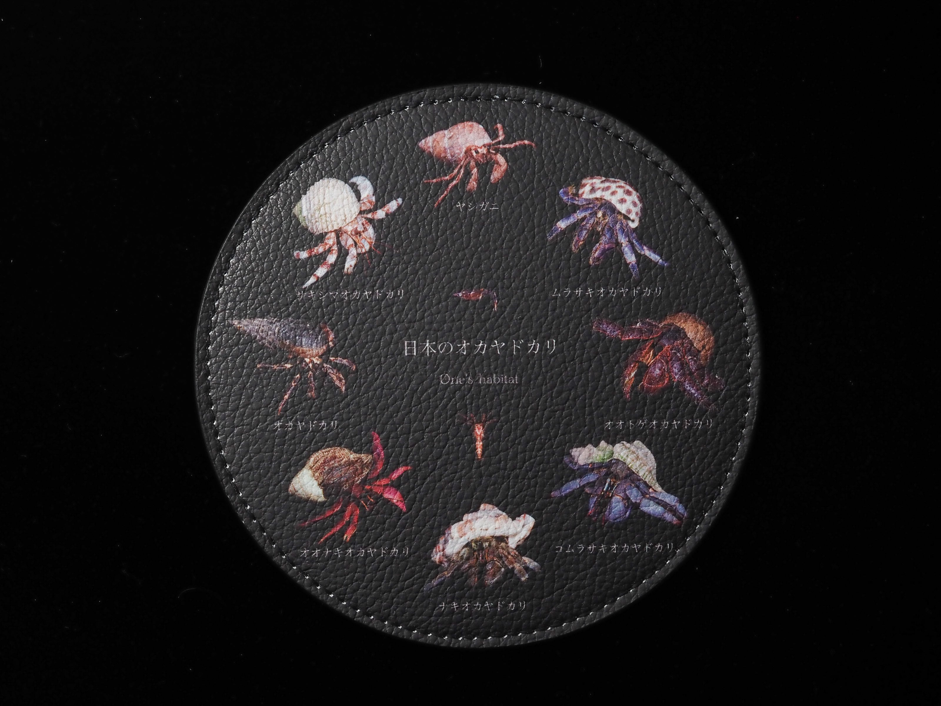 日本で見られるオカヤドカリ科全8種が円形に並ぶフェイクレザーコースターです。ゾエア幼生とメガロパ(グラウコトエ)幼生も載った豪華なラインナップ。コーヒーブレイクや晩酌等に南の島の鮮やかなオカヤドカリ達を添えませんか。